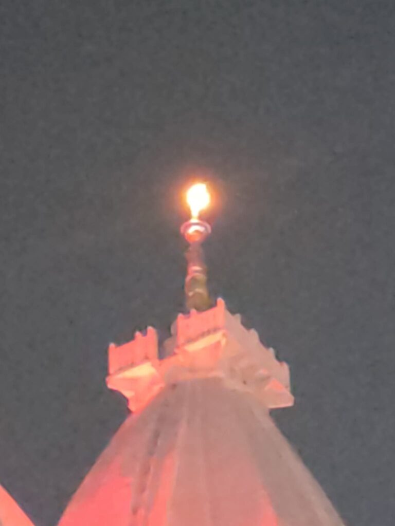 2025.10.20 (Vrindavan Today News): There is an old saying “नंदभवन दिवला जुरै, जगत उजाड़ौ होय।” When the Divla (grand lamp) of Nandbhavan is lit on the top of the temple on the day of Diwali, the entire Braj region glows with divine radiance. It is believed that Shri Krishna and Shri Balaram, along with Nand Baba and Mother Yashoda, celebrated this festival in Nandgaon itself. The celebration continues to this day with grandeur, devotion, and joy, filling the air with the spirit of Brajbhakti. According to temple tradition, on the day of Diwali, a sacred lamp weighing five and a quarter kilograms is prepared using pure cow ghee, binora (cotton wick mixture), and cotton. In the evening, the sevayat family (temple priests) perform a ritualistic worship of this lamp with full devotion and prescribed Vedic procedures. Later at night, the flame of the grand ‘divla’ is lit atop the temple spire, illuminating the sanctum with divine radiance. It is believed that people do not begin the worship of Goddess Lakshmi and Lord Ganesha in their homes until they have witnessed the lighting of this sacred Divla (lamp). The residents of Nandgaon consider the very moment when the Divla is lit to be the most auspicious time. Meanwhile, the melodious strains of Samaj Gayan (devotional singing) resonate through the halls of Nand Bhavan, marking the beginning of Diwali celebrations across the entire village. The Goswamis of Nangaon recall that nearly 200 years ago, even the kings of Bharatpur used to come to Nand Bhavan to witness this divine lamp. In those days, the flame was so powerful that it could be seen all the way from the Bharatpur palace. Back then, there were no tall buildings and the air was clear—so the divine glow of the Divla illuminated the land of Braj,” The goswamis said with reverence.