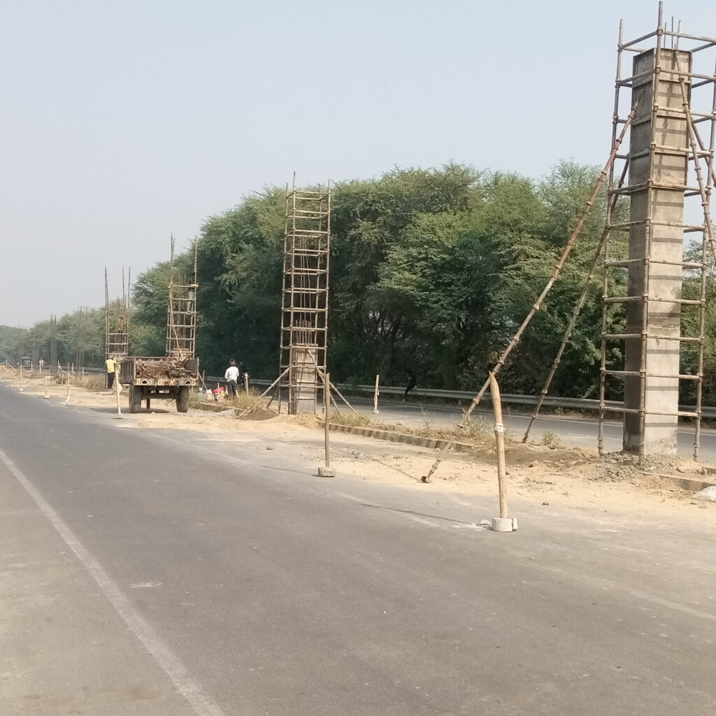 The construction of these “84 Bhakti Stambhs” is progressing rapidly on the central divider of the road stretching approximately 2.25 kilometres, from the Yamuna Expressway entry point up to the helipad area, just beyond two bridges. The pillars are being erected at intervals of about 15 metres, creating a continuous devotional corridor for pilgrims arriving in Vrindavan.