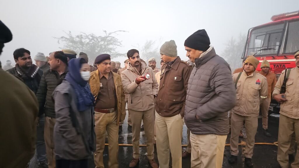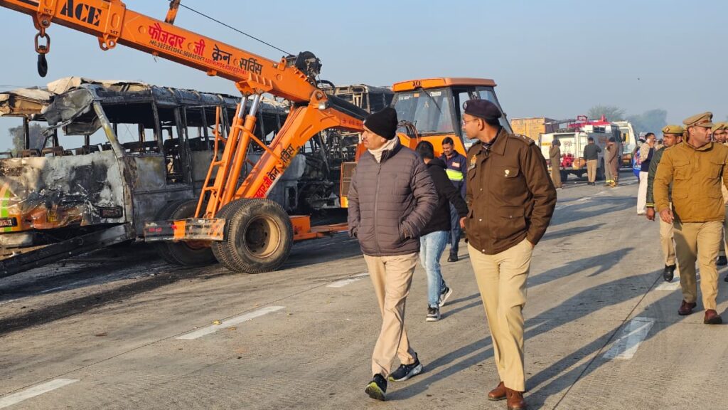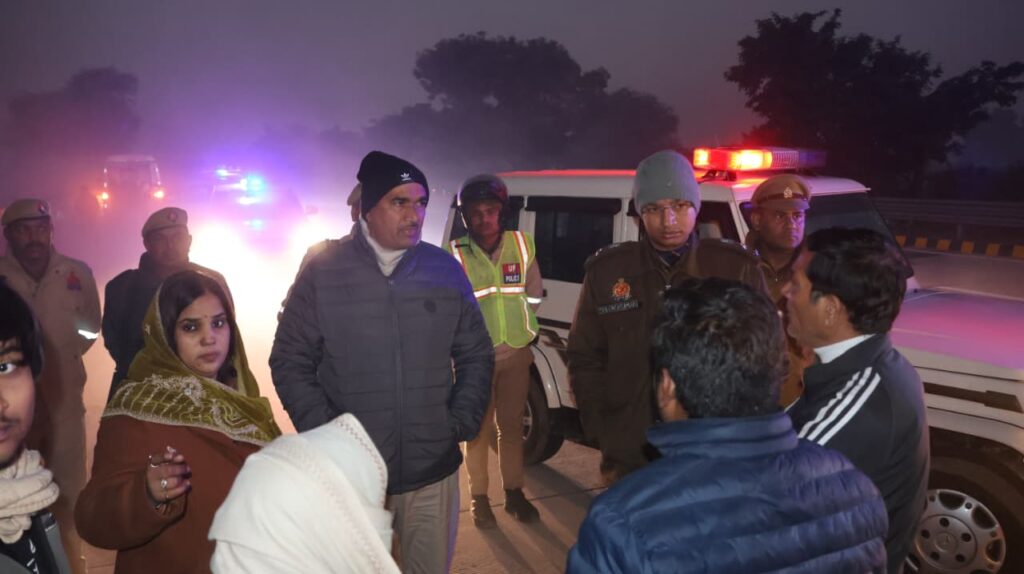 Mathura, December 16, 2025 (Vrindavan Today News): A major road accident occurred late last night at around 4:30 a.m. on the Yamuna Expressway near milestone 127, while vehicles were travelling from Agra towards Noida. Due to dense fog and extremely low visibility, seven buses and three smaller vehicles collided, resulting in the death of four persons and injuries to 25 others.